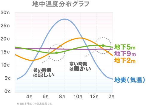 井戸水が夏冷たく感じる、冬暖かく感じるように地中内は外気に影響されずその地域の平均温度で安定しています。特に深さ5m前後の地中熱は地盤の特性により夏は比較的温度が低く、冬は比較的温度が高いことが分かります。(グラフ参照※クリックで拡大)GEOパワーシステムはこの深さ5mの地中熱を専用の熱交換パイプにより安価で効率よく利用することができます。