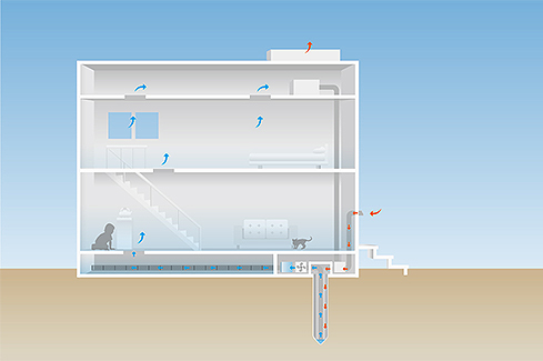 GEOパワーシステムは、私たちの足元にある自然のエネルギー「地中熱」を利用し基礎空調を行う24時間計画換気システムです。つまり、冷暖房のように急激に温度を調整するのではなく、換気をしながら建物全体の温度をゆるやかに調整し冷暖房の空調負荷を軽減します。